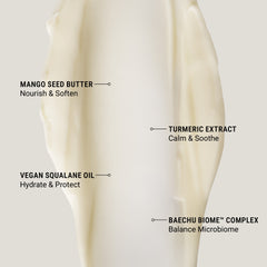 Mango seed butter softens and smooths, turmeric extract calms and soothes, vegan squalane restores hydration and prevents moisture loss, and Baechu Biome™ Complex balances the microbiome and strengthens the skin barrier.
