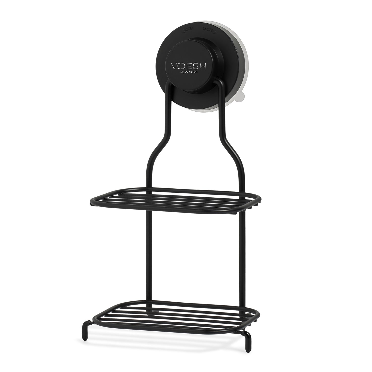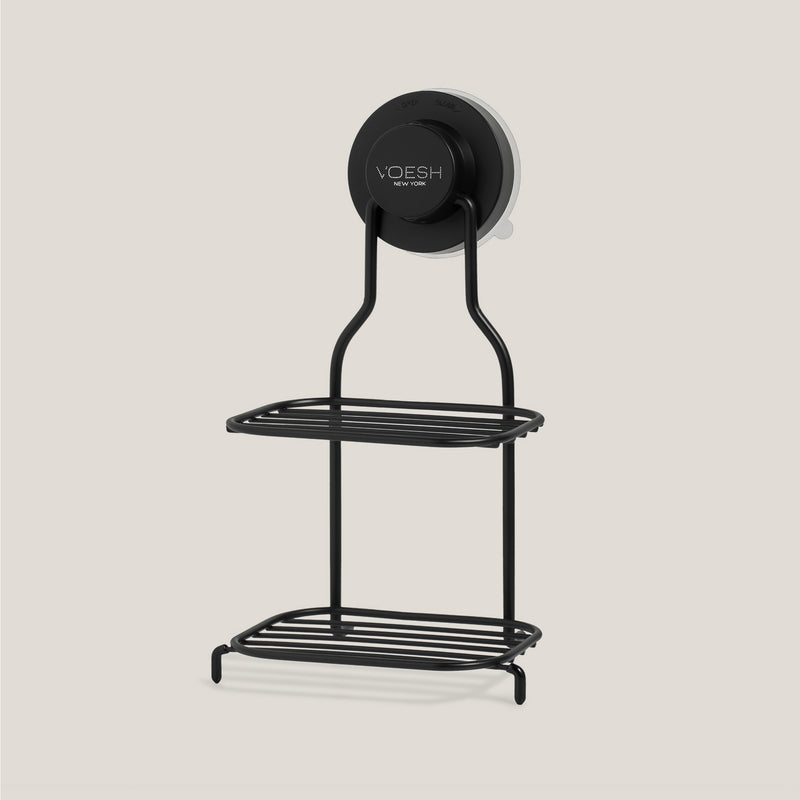 To install the Self-Draining 2-Tier Soap Holder, start by choosing a smooth, untextured surface such as tile or glass and wipe it clean. Press the suction cup firmly against the wall to remove any air, then slide the shelf into the suction cup groove and tighten the knob by turning it clockwise. Once secured, place your soaps on each tier. To remove the holder, simply turn the knob counterclockwise and gently release the suction cup from the wall.